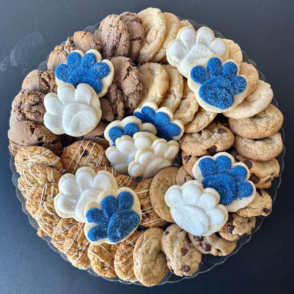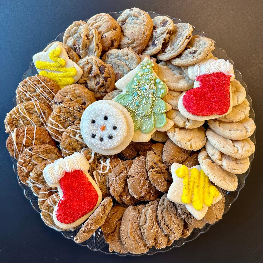 Large tray includes 5 doz cookies and 8-12 decorated sugar cookies. Choose to add on one dozen mini fudge brownies optional.