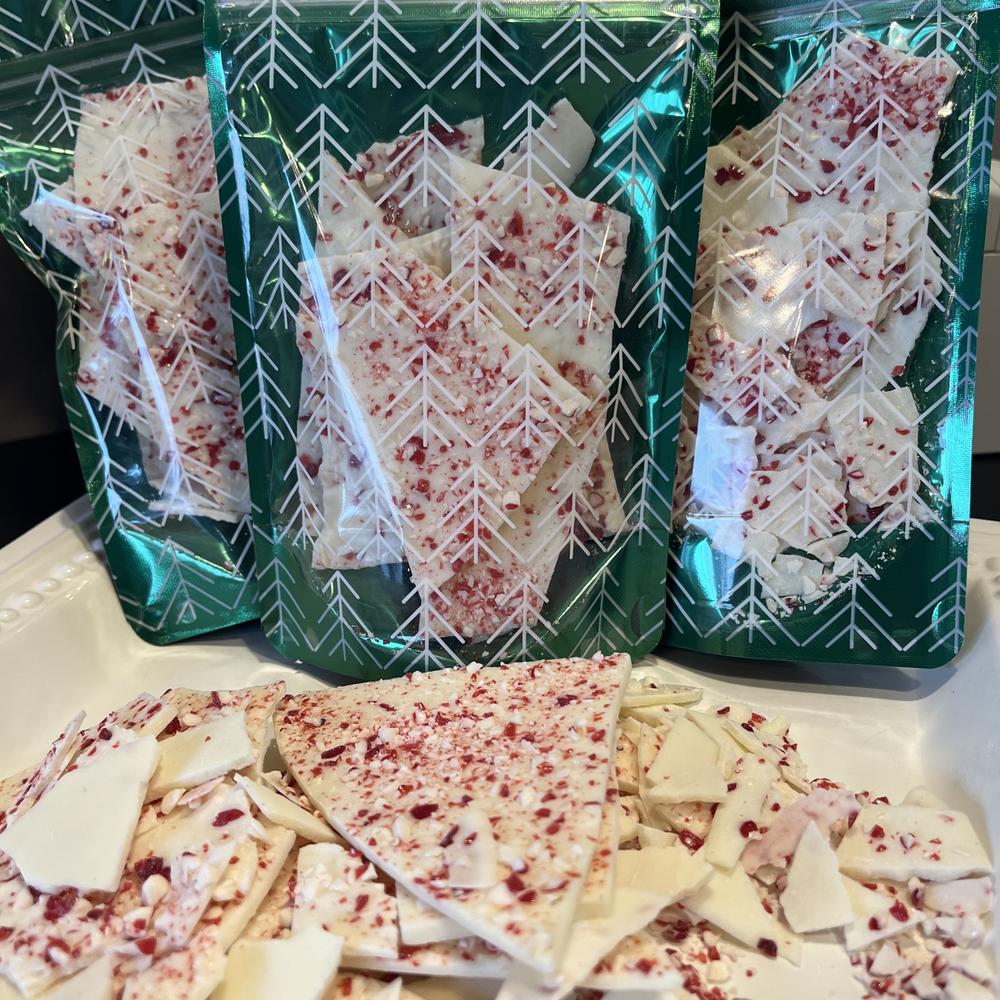 Our peppermint bark is made in house with white chocolate and peppermint candy. It is sealed in a beautiful green windowed presentation bag for gift giving.